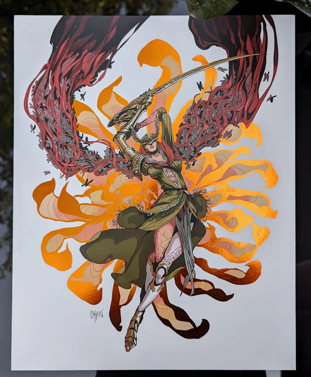 Digital laser print on 13pt uncoated cardstock paper with orange foil accents. Full bleed 11 x 14 inches (28 cm x 35.5 cm)